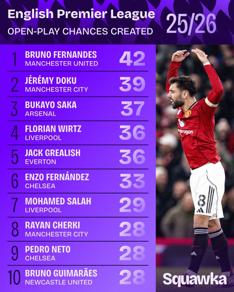 1月27日讯 Squawka统计本赛季至今英超球员运动战创造机会次数,B费42次居首,多库39次第二,萨卡37次第三。