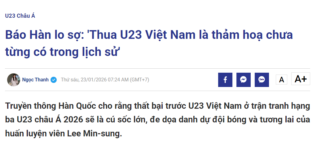今日,越南媒体《tuoitre》转发了韩国媒体的报道,韩国媒体指出三四名决赛直接关乎到韩国青年队的荣誉,一旦输给越南队,那么韩国队将是一个巨大的打击,历史上前所未有的灾难,也会影响到球队的荣誉、主教练李敏成的帅位未来。