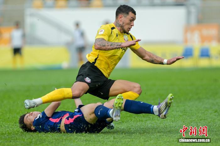 4月7日,2025-26年度中国香港足球总会联赛杯决赛在香港旺角大球场上演,理文队以2:1击败杰志队,夺得冠军。理文队成立于2017年,是香港足坛劲旅。图为理文队球员胡晋铭(黄衣)与杰志队球员利安度拼抢。中新网记者 陈永诺 摄