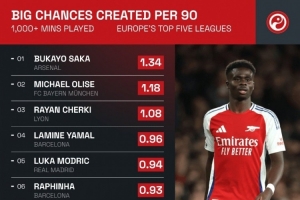 体育资讯4月1日讯 Squawka统计了本赛季五大联赛球员每90分钟创造重大机会的次数,萨卡1.34次居首,奥利塞1.18次第二。