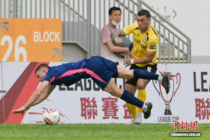 4月7日,2025-26年度中国香港足球总会联赛杯决赛在香港旺角大球场上演,理文队以2:1击败杰志队,夺得冠军。理文队成立于2017年,是香港足坛劲旅。图为理文队球员胡晋铭(黄衣)与杰志队球员利安度拼抢。中新网记者 陈永诺 摄